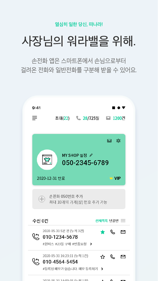 '손님전화' 앱 설치만으로 050고객센터 번호를 부여받아 사용할 수 있습니다.